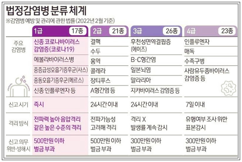 : 질병관리청에서 분류하고 있는 법정 감염병 등급 체계로는 1~4급으로 나누어지는데, 그중 백일해는 2금 감염병으로 24시간 이내 신고 하여야 하며 주요 감염병으로는 결핵, 수두, 홍역, 콜레라, 장티푸스, A형 간염, 백일해, 풍진, 한센병 등이 있습니다.